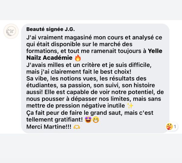 C’est LE meilleur investissement à faire pour toutes les NailTech ambitieuses qui ont envie de magnétiser plus de clientes, retrouver leur confiance en elle et se dépasser à chacune de leur pose ! investir dans une formation ongle gel haute gamme c’est investir en soi, en sa business pour l’amener au niveau supérieur ! Ne manque pas l’ouverture de la prochaine Année qui débutera à l’automne ! Met toi sur la liste VIP !